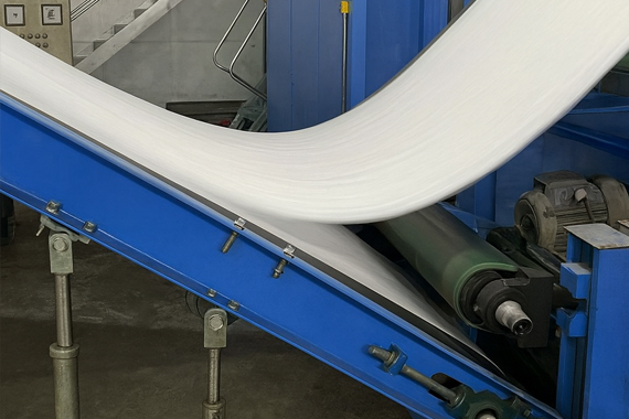 A continuación, los copos de PET pasan por una extrusora, donde se funden y se hilan en fibras de poliéster. Este proceso transforma el plástico rígido en una textura suave, parecida a la lana. A continuación, las fibras se transforman en finas láminas, listas para la fase de fieltrado.